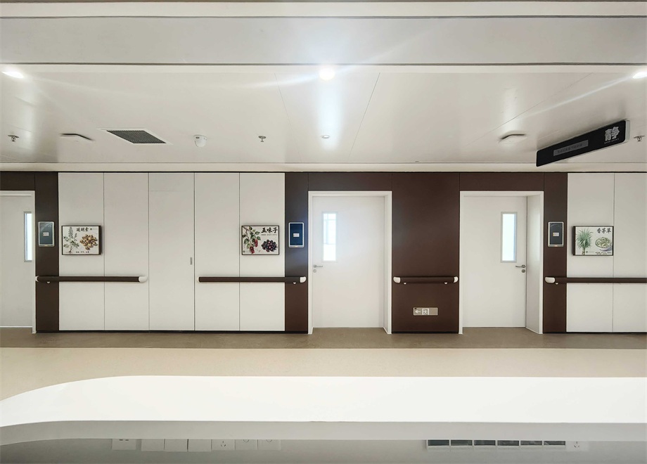作为医院新建的专业化儿内科诊疗阵地,十号楼在设计之初便充分考量临床实用需求,走廊两侧提前设置了床头设备电箱,集成氧气、负压吸引、监护仪器等医疗设备的电源插座,全面满足未来加床扩容的使用需求。设备电箱采用滑动门设计,日常处于关闭状态,既保障用电安全,又便于后勤管理,使用时轻推移门即可操作,兼顾实用性与便捷性。在大楼整体装修阶段,邵蔚院长立足美学设计与医院特色,提出将设备电箱移门与文化装饰相结合的创意,明确内科区域采用中药元素图画装饰,儿科区域延续医院门诊儿童输液区的海洋系列科普风格,让功能性设施兼具观赏价值与科普意义。