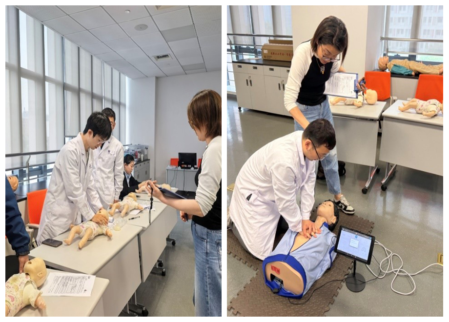 本次培训由医院教育处时珺、张锡凤两位专业导师主讲,课程紧贴医院工作场景,内容涵盖成人、儿童、婴儿心肺复苏(CPR)、自动体外除颤仪(AED)规范使用、气道异物梗阻解除、内科急症、外科急症及环境相关急症应急处置等核心技能,培训采用理论讲解、视频教学、分组实操、模拟演练相结合的方式,导师结合临床真实案例,深入浅出讲解要点,手把手指导操作。参训人员认真学习、积极练习,在模拟场景中反复训练按压频率、深度、通气技巧及 AED 操作流程,确保动作规范、流程熟练。