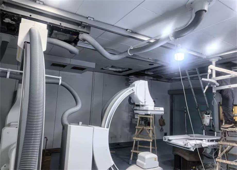 本次搬迁改造项目于2025年11月4日开工,行政处专业技术团队与信息统计中心、临床医学工程处和保卫处等多部门紧密配合,严格按照施工计划,从墙体、吊顶、风管拆除的前期准备,到顶棚钢架及铅防护、墙面与地面铅防护的辐射屏障搭建,再到管线预埋、墙面洁净板搭设、电动门安装等全流程改造,每一个环节都精准衔接。为保证导管室内设备的正常运行,还新增了配电箱、医气管道及配套空调系统。施工结束后,由专业监测机构分别对观察窗、防护门、外墙面、泄压口等13个关键点位进行放射防护检测,辐射剂量当量率均满足相关标准要求。